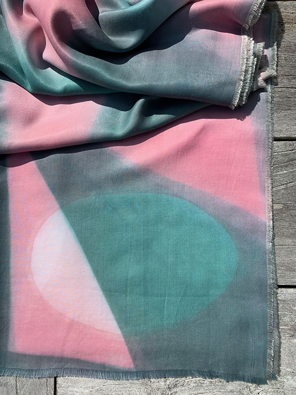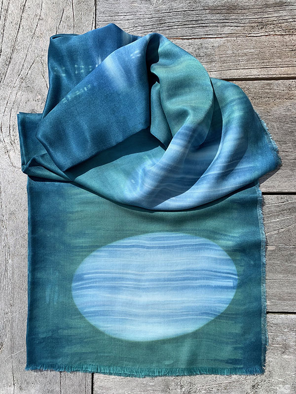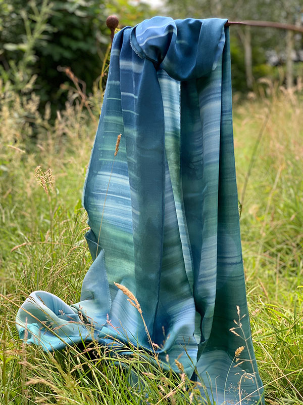 Kathryn uses a series of Shibori and print processes to create layers of colour and texture within each unique piece of work. Her scarves are hand-dyed using a high quality silk and bamboo mix fabric and are available in a range of sizes and prices.
